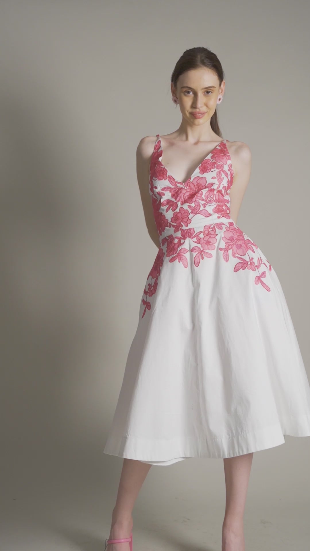 Applique work in a hot pink coloured floral design, created using organza. Relaxed fit midi dress in cotton satin with full lining featuring handcrafted braided straps on one shoulder and knotted straps on the other, an invisible back zip fastening and side pockets.