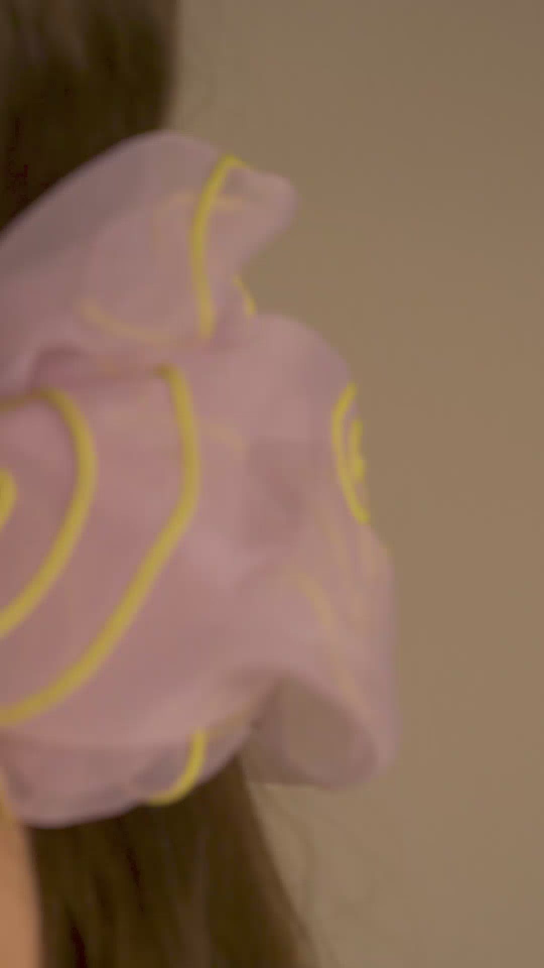 Oversized organza scrunchy in lavender color with yellow spiral embroidery detail.