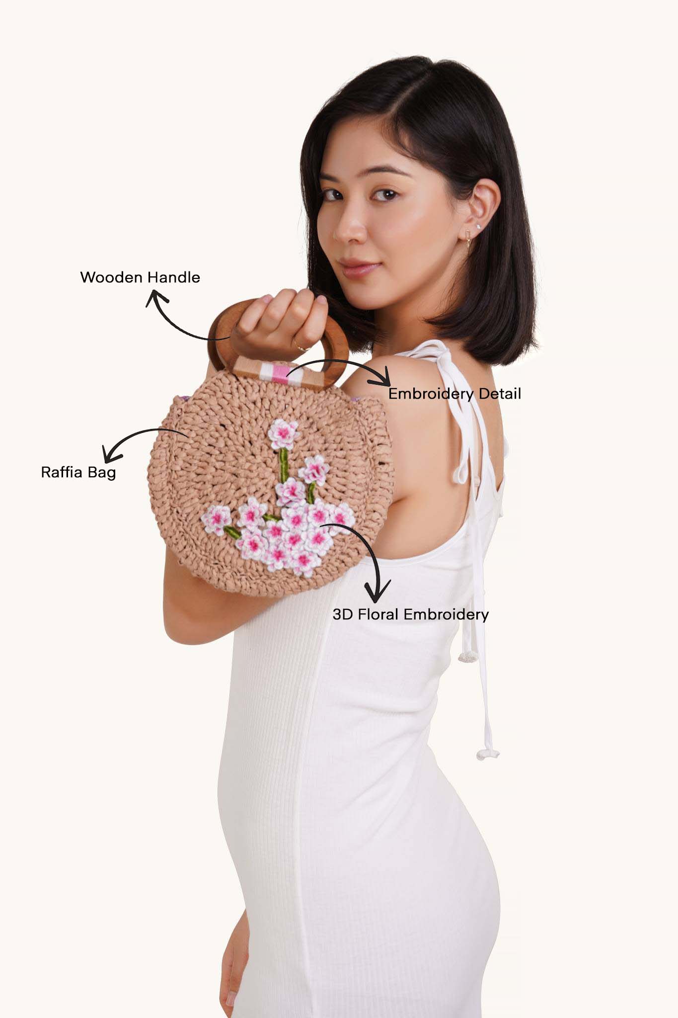 Our versatile handwoven round sling made from raffia, features threadwork handles and embroidery detaling, which are inspired by floral wreath.