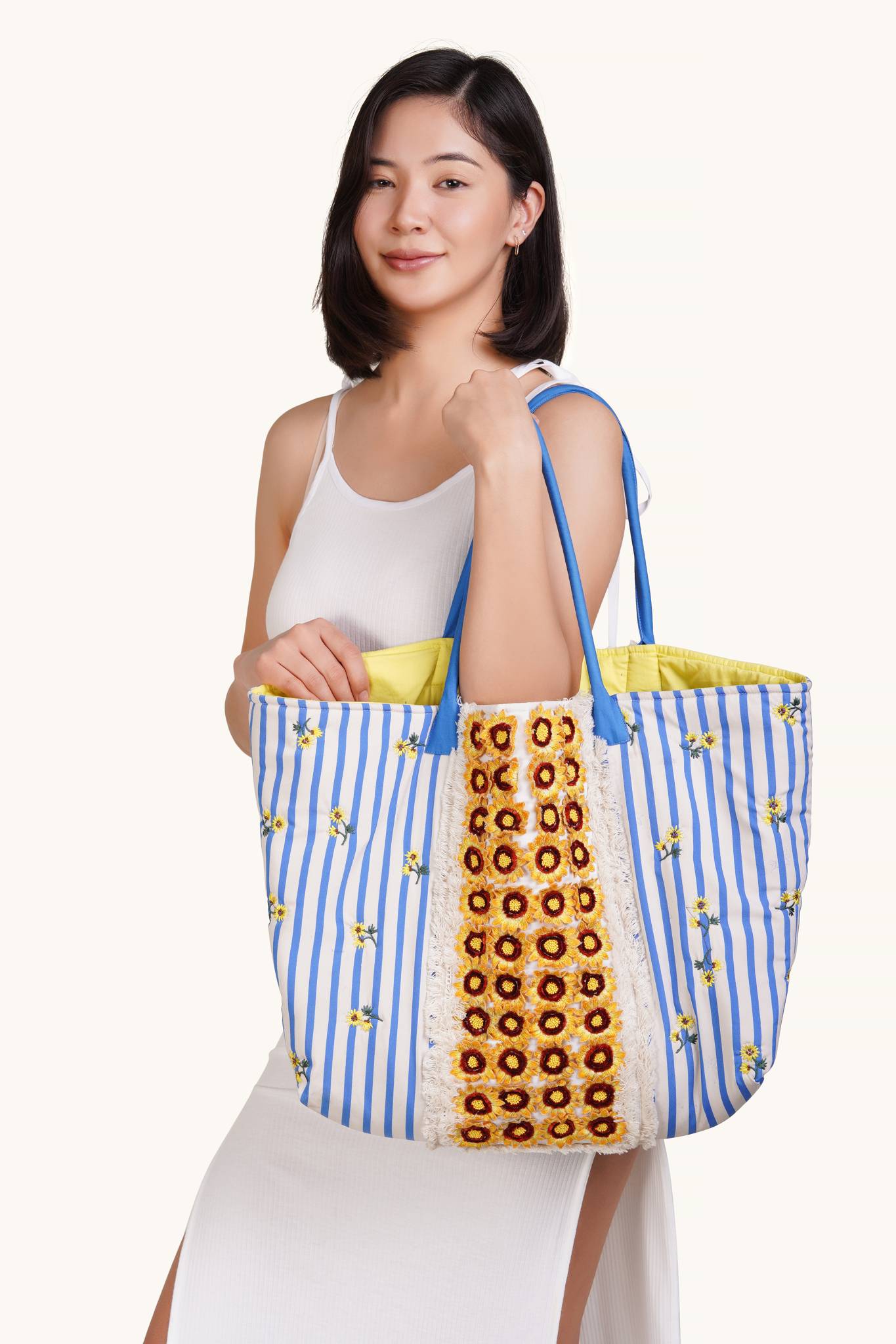 Quilted tote with floral embroidery motif in fun colours with persian blue stripe is a light-weight and easy to carry tote, a perfect selection for your getaways.