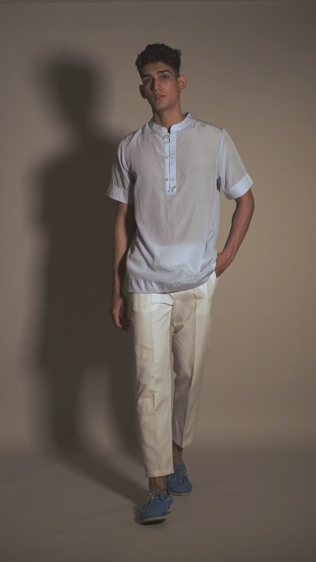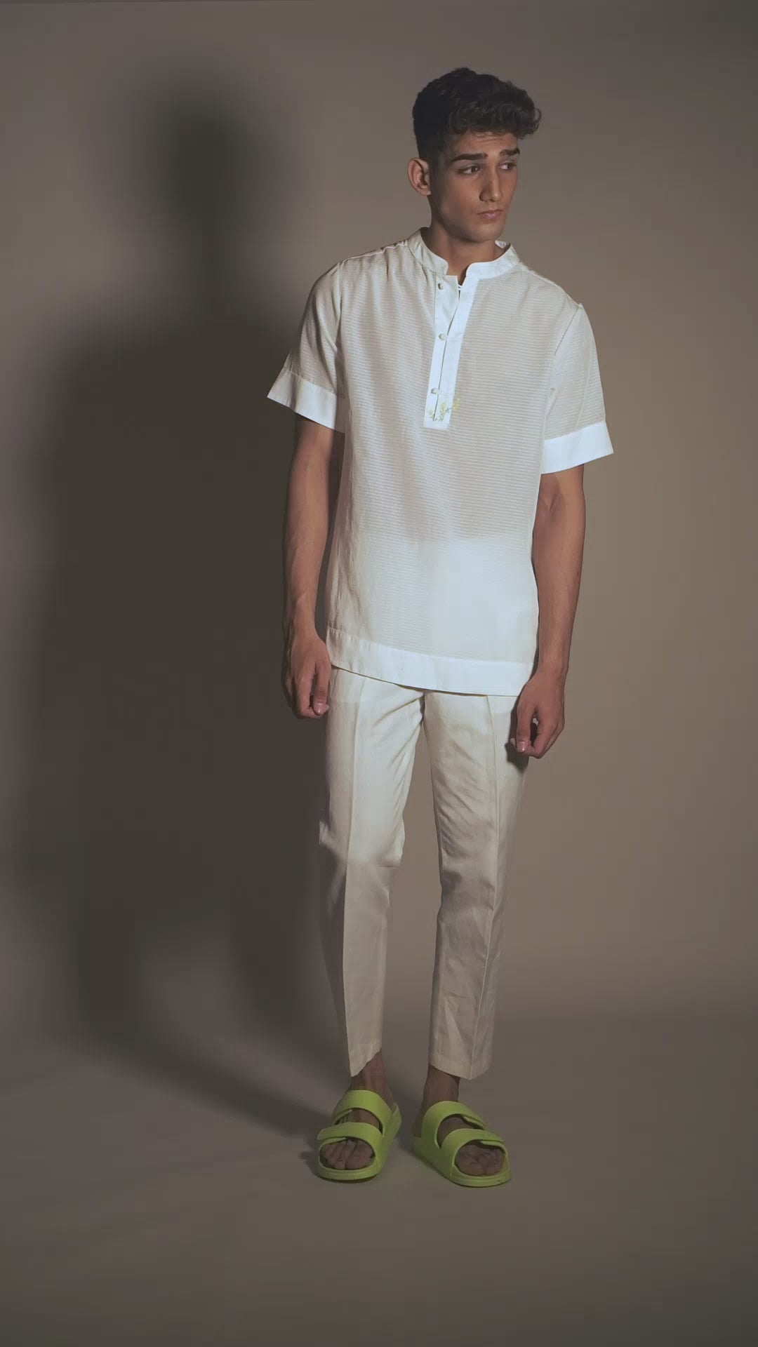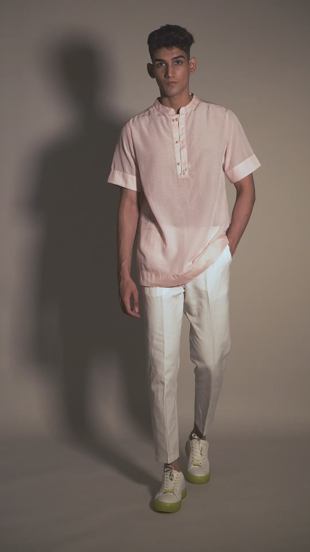 Relaxed-fit cotton shirt featuring a band collar and short sleeves. Knotted buttons with a delicate floral embroidery detail at the bottom.