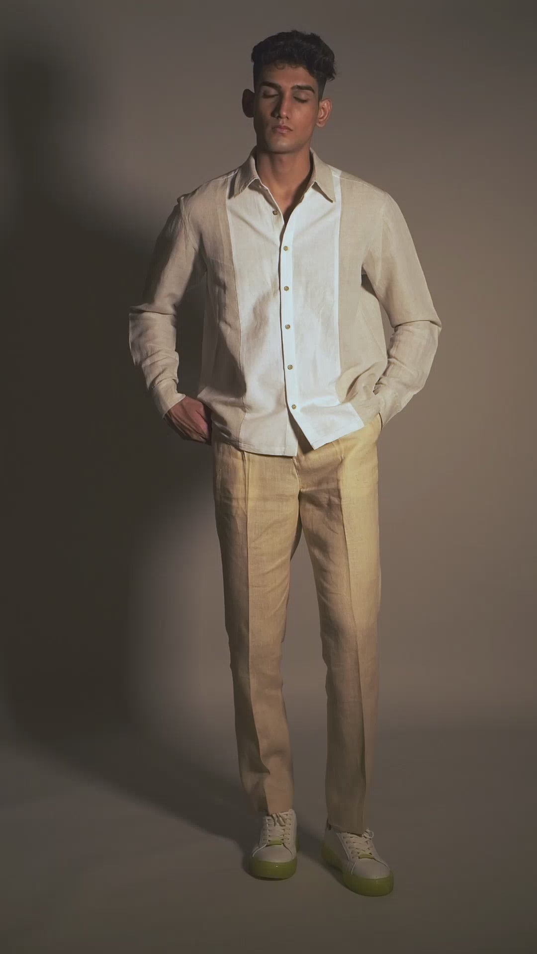Dual-tone, panel shirt in linen, with buttons down the front and at the cuffs. From a day at the beach to a walk in the city, the neutral colours make this piece versatile enough to be worn everywhere.