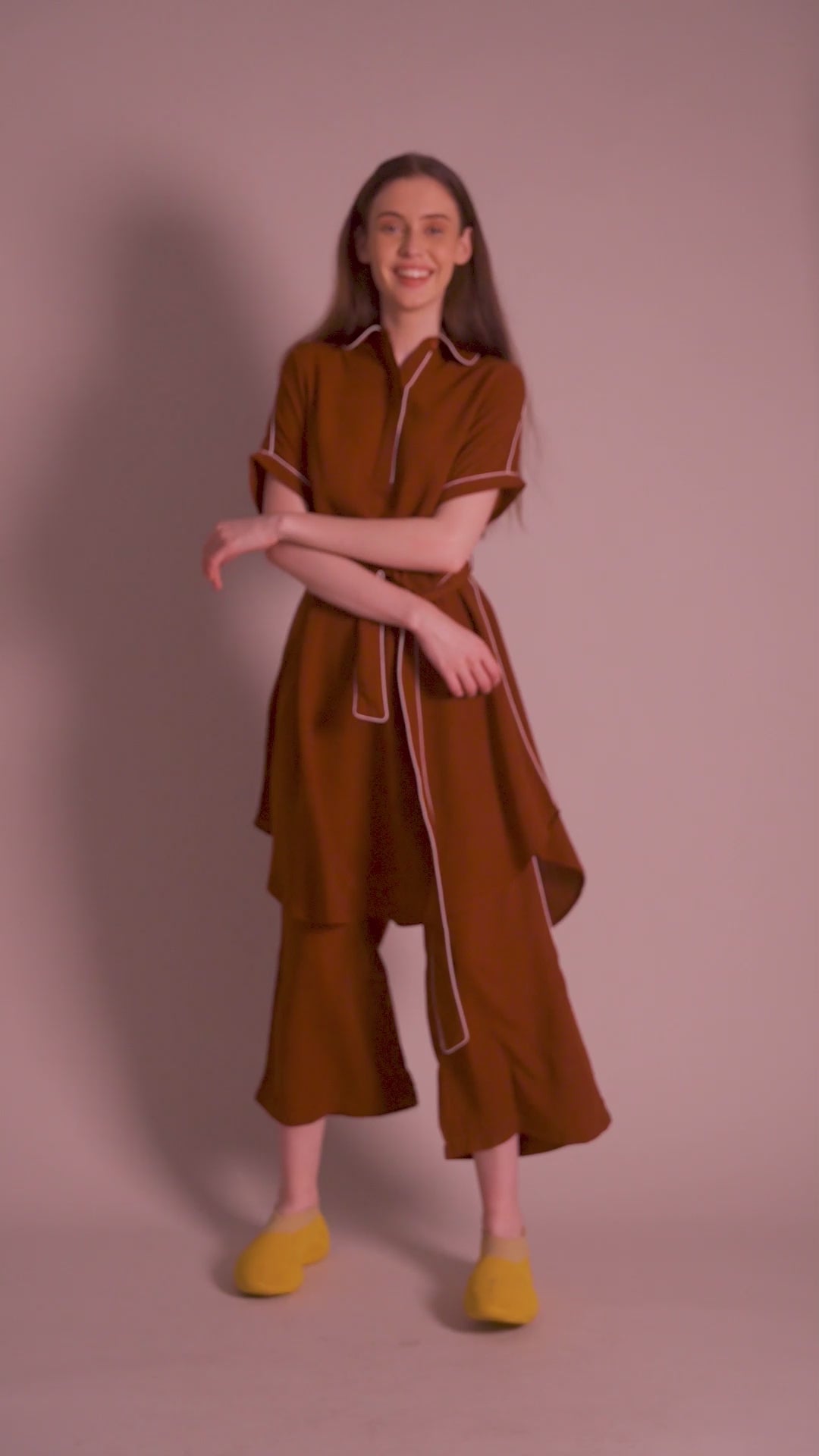 Tunic with a Peter Pan collar, short sleeves and a tie-belt around the waist.
