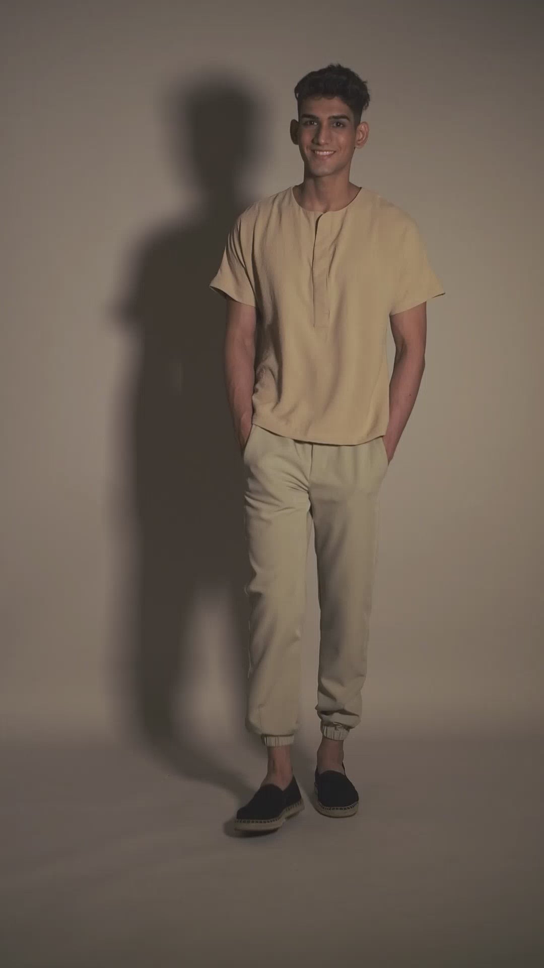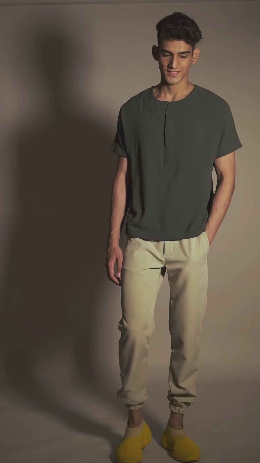 T-shirt in crushed cotton fabric, with short sleeves and a front open placket. The pipe detailing makes this relaxed-fit piece a vacation wardrobe essential, adding to its simplicity.