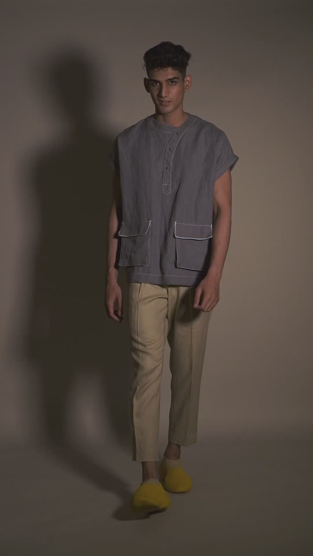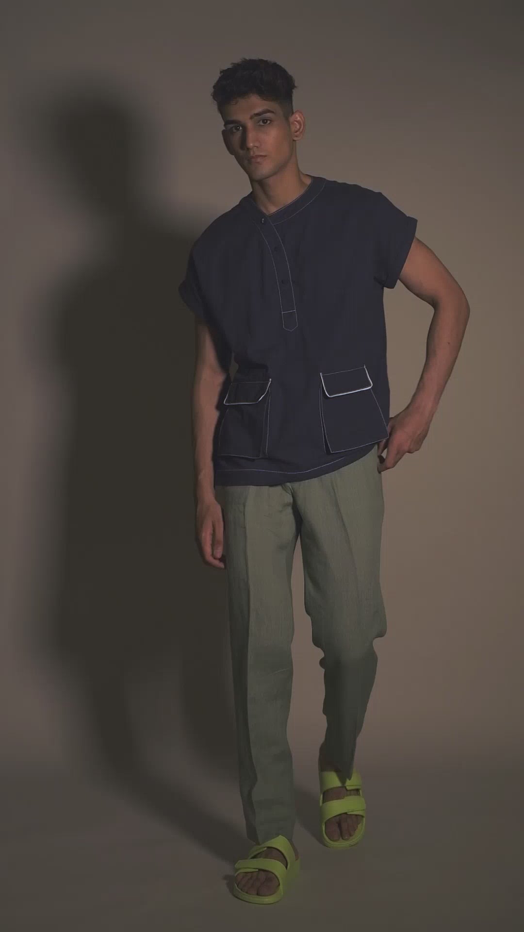 Relaxed-fit linen shirt featuring contrast stitch detailing, short sleeves, welt front pockets with a flap and front buttons on an asymmetrical placket. Wear it with a pair of sneakers for a walk on a sunny day in the city.